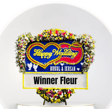 Papan bunga berukuran besar yang memuat ucapan "Happy Wedding" serta nama pengirim. Desainnya dibuat mencolok dengan warna cerah agar mudah terlihat dan mencuri perhatian di antara banyak karangan lain.Standing Flower